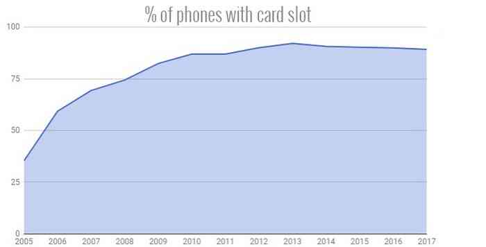 Еще один график показывает на популярность слота для карт памяти microSD. По его данным, пик популярности также пришелся на 2014 год, хотя и на данный момент они присутствуют в большинстве смартфонов, за исключением флагманов. В 2015 году устройства с 8 Гб памяти уступили место 16-гигабайтным версиям. 2016 год был переходным периодом: 8 Гб, 16 Гб и 32 Гб встречаются в одинаковых пропорциях. В прошлом году 16-гигабайтные аппараты стали менее популярны и тенденция должна продлиться и в будущем. На рынке существуют предложения и с 256 Гб встроенной флеш-памяти, но они являются эксклюзивными премиумными смартфонами с нескромной ценой.