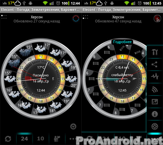 - почасовой прогноз на 24 часа в виде аналоговых часов.
