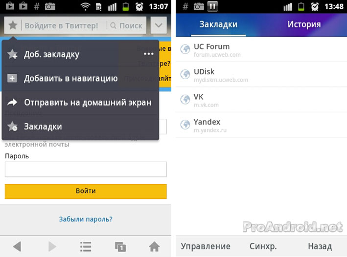 Слева от адресной строки находится кнопка «Избранное». При нажатии на нее можно перейти в меню «Закладки», добавить текущий сайт к закладкам или к панели быстрого доступа (навигации), а также создать ярлык на рабочем столе устройства. В меню «Закладки» можно просмотреть текущие закладки, перейти на любую из них, упорядочить их, создать папки и синхронизировать закладки. Там же можно перейти на вкладку «История», на которой можно просмотреть последние посещенные сайты. Приложение способно синхронизировать с облаком закладки и другие личные данные при помощи сервисов Google, Facebook или аккаунта UC. Эта возможность пригодится тем, кто использует этот браузер сразу на нескольких устройствах. Например, дома можно работать на планшете с несколькими сайтами, а выйдя на улицу — продолжить работу с ними на смартфоне всего парой жестов. Эта же функциональность доступна и для браузера Google Chrome, для которого потребуется установить расширение UC Sync из фирменного магазина Google. Таким образом вы можете синхронизировать данные вашего настольного компьютера и всех мобильных устройств.