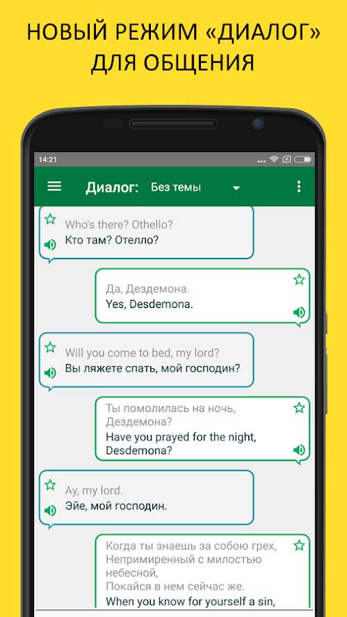 Переводчик Translate.Ru — приложение для Android, при помощи которого можно пользоваться услугами популярного онлайнового сервиса переводов и словарей. Вы можете переводить небольшие тексты с нескольких языков, включая русский, английский, немецкий, испанский и другие. Переводчик дает возможность переводить SMS, страницы в интернете, переписку в чате, фрагменты текста из буфера обмена смартфона и так далее. При этом вы можете указывать тематику текста, что повысит качество и точность перевода. Кроме этого можно просто надиктовывать текст для перевода.