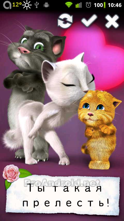 В арсенале Тома и Анжелы девять красивых, не лишенных юмора, открыток с текстом на русском языке. Открытку можно отправить по электронной почте, по MMS или опубликовать на Facebook. Также открытку можно сохранить на SD-карту Android-смартфона или планшета.
