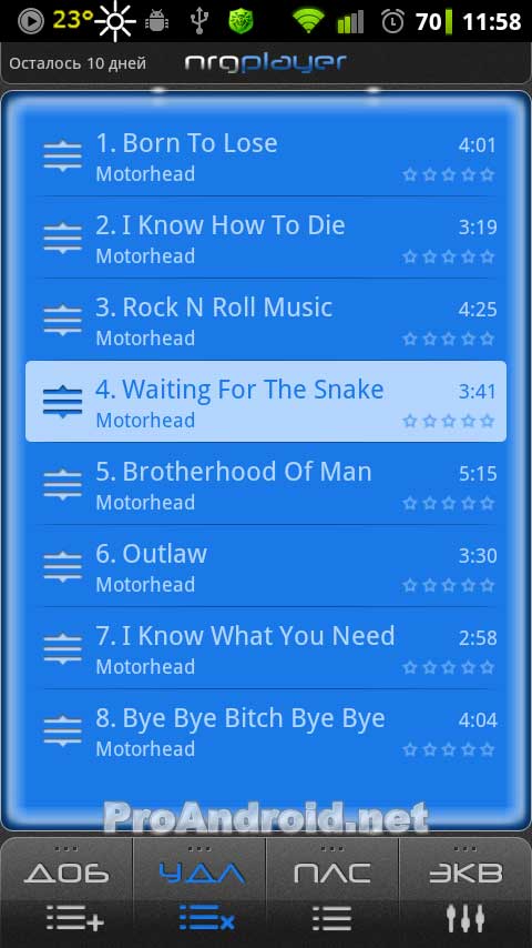 NRG Player — качественный музыкальный плеер для Android. Вместе с красивым интерфейсом и удобным управлением воспроизведением приложение имеет много возможностей по настройке плейлистов и звучания музыки. Имеется встроенный 10-полосный эквалайзер с несколькими пресетами, отдельное регулировка усиления низких и высоких частот.