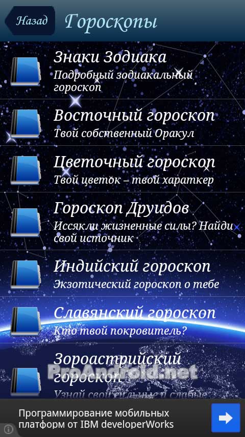 Сборник Гороскопов — очень интересное приложение, отличающееся от подобных ему тем, что здесь вы найдете не только ставшие уже привычными описания характера человека согласно его знака зодиака или восточного гороскопа, но и по довольно экзотическим гороскопам друидов, цветочному и индийскому гороскопам. Кроме этого программа содержит совсем уж редкие славянский, зороастрийский и египетский гороскопы, а также гороскоп мифов. К каждому из вышеперечисленных вариантов гороскопа прилагается описание, история, его влияние на мировую культуру.