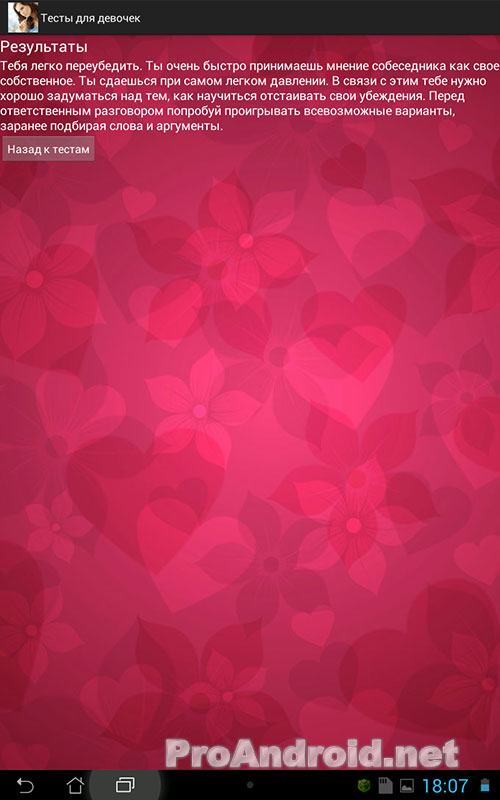 Тесты для девочек — набор интересных тестов для молодых девушек, с помощью которых можно больше узнать о своем характере или характере своих подруг. Кроме этого здесь есть тесты, которые помогут улучшить отношения с парнем. Достаточно просто ответить на несколько простых вопросов, выбрав наиболее подходящий вам вариант ответа, и вы больше узнаете о себе и своих близких.