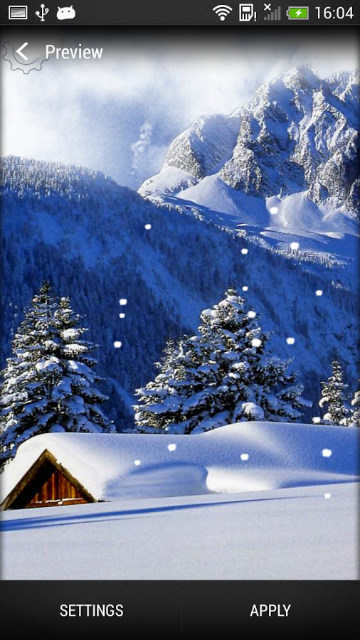 Снегопад Живые Обои — обои на тему зимы. Падающие снежинки кружатся на фоне красивых видок гор, полей, заснеженного леса, городов. По экрану проплывают снежные облака, время от времени скрывая часть картинки.