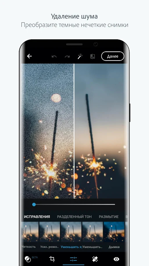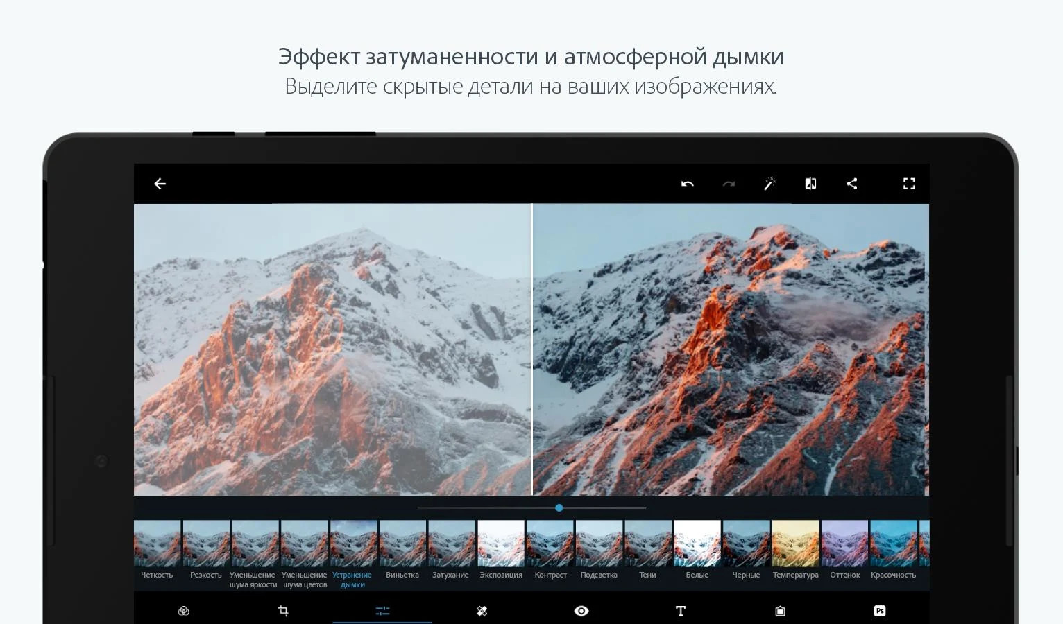 Редактор позволяет гибко настраивать такие параметры снимка, как яркость, экспозиция, четкость, шумность, контрастность. Можно «вытянуть» или заглушить детали в светах и тенях, подкорректировать цветовую температуру изображения. Корректировку некоторых из этих параметров можно возложить на Photoshop Express, выбрав опцию «Auto». Вообще, вы можете выполнить весь процесс в авто-режиме.