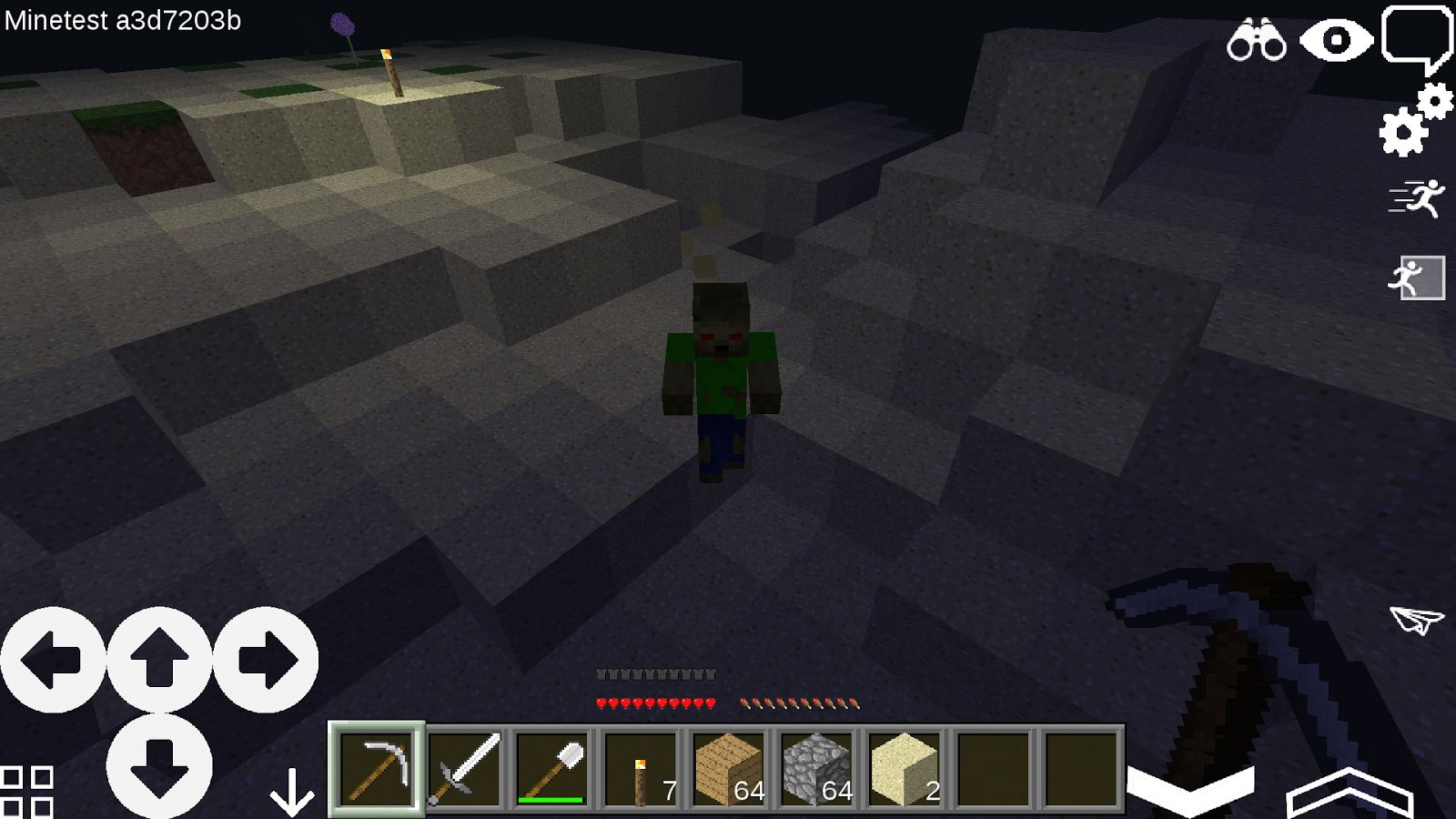 Управление в игре очень простое. Для перемещения используйте кнопки со стрелками в левом нижнем углу. «Крутите» головой, скользя пальцем по экрану. Выбирайте инструменты и материалы, тапнув на них в специальной панели инвентаря. Для того, чтобы поместить какой-то блок, выберите его (возьмите в руку) и дважды тапните на то место, куда хотите его поставить. Чтобы разделить блоки нужно так же выбрать блок, а затем одновременно тапнуть по двум пустым ячейкам.