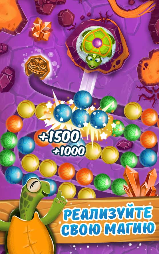 Стреляйте так, чтобы соединять вместе по три и более шаров одного цвета. Можно создавать каскадные взрывы, когда уничтожение одних шаров приводит к соединению других цветов и так далее.