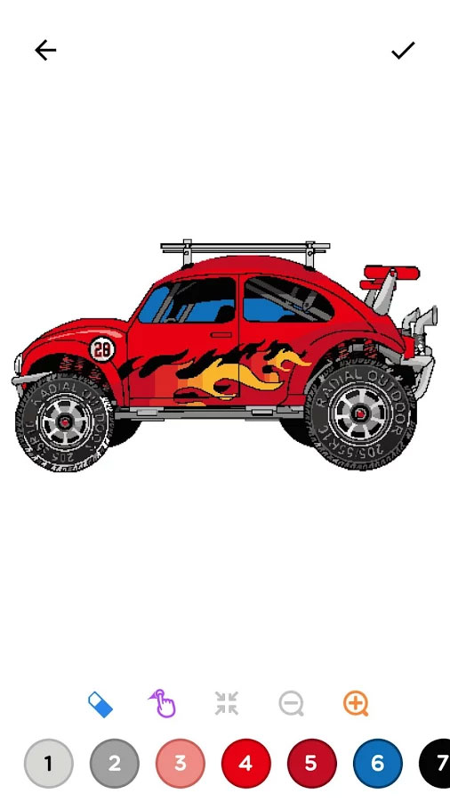Во время разукрашивания рисунок можно уменьшать и увеличивать, получая доступ к более мелким и сложным участкам. Когда вы выбираете на палитре какой-то цвет, то все квадраты, соответствующие этому цвету на самом рисунке, будут подсвечены. Рисовать можно, расставляя отдельные точки, или сразу непрерывными линиями. Для этого достаточно подержать палец на одном месте около секунды. Для смещения по рисунку используйте два пальца одновременно.