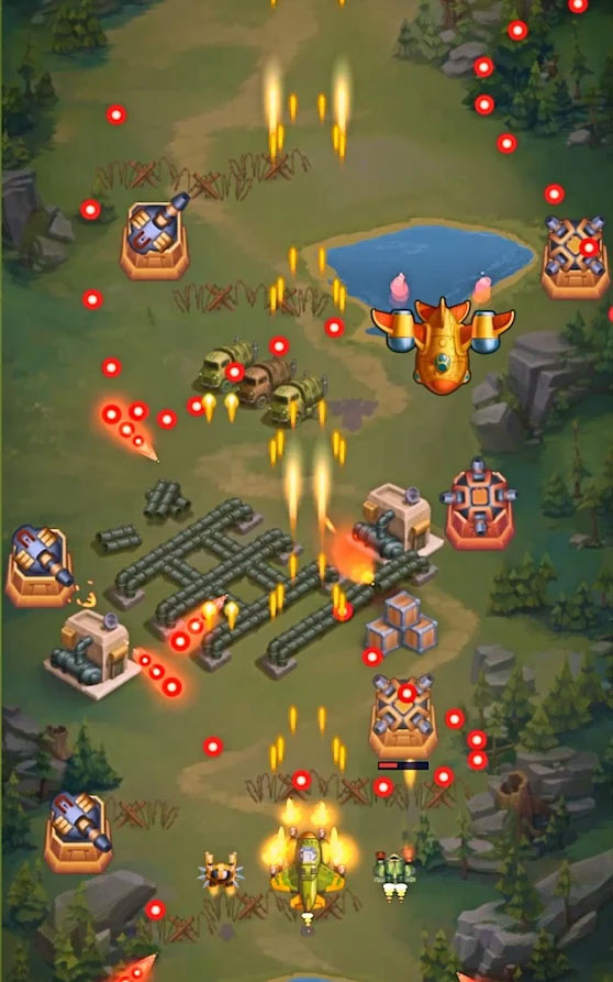 Как и в старых добрых аркадах такого типа, вам предстоит лететь вперед на боевом самолете, уничтожая все вражеские силы. Это могут быть воздушные суда, ракеты, бомбы, наземные артиллерийские установки, склады, поезда и машины. Все это одновременно движется, крутится, стреляет, выпускает целые тучи снарядов, от которых желательно уклоняться. Прибавьте к этому необходимость ловить монеты и бонусы и вы поймете, что скучать не придется ни секунды.