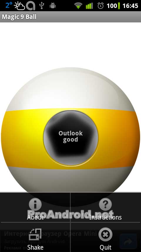 Если ваше Android-устройство не имеет встроенного акселерометра, то на экране будет кнопка "Ask the Magic 9 Ball". Всего имеется 20 оригинальных ответов, как и в классическом магическом шаре.